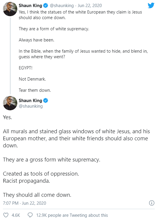 Source : https://www.dailywire.com/news/tear-them-down-blm-activist-shaun-king-calls-for-destruction-of-jesus-christ-statues-churches-for-white-supremacy-oppression-racist-p