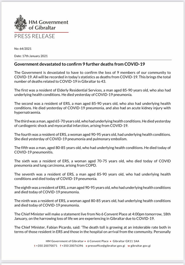 « Gibraltar a enregistré 13 autres décès liés à Covid au cours d’un week-end « dévastateur », ce qui a porté le nombre de décès à 43 depuis le début de la pandémie. Au cours de la seule semaine dernière, 27 personnes sont décédées soit directement à cause du virus, soit alors qu’elles étaient infectées par celui-ci. Neuf décès liés au Covid ont été enregistrés dimanche, le pire en une seule journée depuis la crise de santé publique d’il y a près d’un an. »