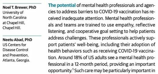 Ajoutons la traduction des conclusions :« L’utilisation du vaccin Covid-19 et d’autres vaccins est faible chez les jeunes adultes, l’âge d’apparition de tout problème de santé mentale. Elle est également plus faible dans les communautés touchées de manière disproportionnée par le Covid-19. La création d’opportunités pour un accès équitable à la vaccination contre le Covid-19 a aidé les efforts américains à atteindre les communautés affectées de manière disproportionnée afin d’augmenter l’adoption du vaccin. L’adoption de nouvelles approches pour accroître la vaccination des adultes est une priorité nationale. Bien que la santé mentale ne soit pas la première chose qui vienne à l’esprit lorsqu’on pense à la vaccination, l’utilisation stratégique de l’expertise des professionnels de la santé mentale pourrait offrir de nouvelles opportunités pour encourager la vaccination contre le Covid-19. Une meilleure compréhension de ce en quoi la santé mentale affecte la manière dont sont perçus les vaccins Covid-19 et une meilleure définition de la manière dont les professionnels de la santé mentale peuvent aider, en particulier pour les communautés affectées de manière disproportionnée, sont désormais d’une importance fondamentale et pourraient renforcer les efforts de vaccination. L’engagement des organisations de professionnels de la santé mentale, et éventuellement des formations pour leurs membres, pourrait être une autre étape importante. »En gros, toute personne ne cédant pas à la pression de se faire injecter un produit transgénique expérimental doit être considérée comme malade mentale.