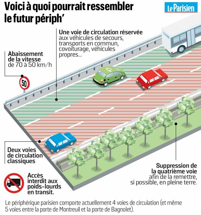 Paris se prépare à restructurer son périph, qui concentre un quart du trafic de la capitale avec 1,2 million de bagnoles, en abaissant la vitesse autorisée à 50 km/h. Adieu les bécanes qui en faisaient le tour à 250 à l’heure vers 3h du matin ! Hidalgo, qui pense à l’électorat vert et qui ’a plus que l’écologie pour verdir son bilan désastreux, veut réduire (après lecture d’un rapport chipé par Le Parisien) le périph à deux voies et ajouter une tranche verte avec des arbres, plus un couloir pour les véhicules d’urgence. Comme ceci :