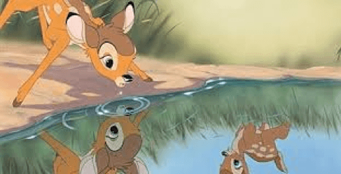 Le fait pour Bambi de s’observer dans la mare symbolise la première prise de conscience de son identité, ou plus exactement de son “moi”. Le « moi » est l’image que nous nous faisons spontanément de nous-même, quand par exemple nous nous regardons dans le miroir.