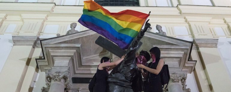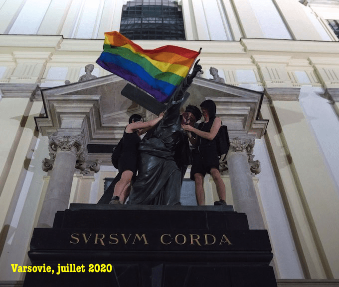 Le 29 juillet dernier, ce sont des militantes LGBT qui ont profané cette statue en couvrant le visage du Christ d’un masque rose et en accrochant leur drapeau à la Croix. Le scandale et la tristesse sont énormes dans la population et chez les responsables catholiques et politiques. Le procureur de Varsovie a ouvert une information. Sans vouloir pousser trop loin la comparaison, notons la similitude des comportements de l’armée du IIIe Reich et du mouvement LGBT dans la haine antichrétienne.