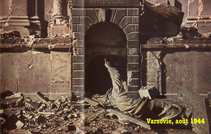 La statue avait été érigée en 1858 puis abattue par l’armée d’occupation allemande en 1944, lors du soulèvement héroïque de Varsovie, elle fut relevée par la suite. On a une troublante photo de cette statue en bronze montrant le Christ portant sa Croix et pointant son index vers le Ciel. Lorsqu’elle fut renversée de son socle, l’index pointait vers les deux mots gravés sur son socle : Sursum Corda, hauts les cœurs, comme une invitation surnaturelle adressée aux Polonais à la confiance et à l’espérance.