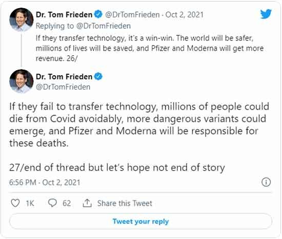 Alors que M. Sahin a affirmé que le partage des brevets ne présentait aucun risque pour le contrôle de la qualité, le PDG de Pfizer, Albert Bourla, a fait valoir à plusieurs reprises que la renonciation aux droits de propriété intellectuelle découragerait l’innovation. Toutefois, des critiques tels que Tom Frieden, ancien directeur des Centres américains de contrôle et de prévention des maladies, ont accusé les entreprises pharmaceutiques de « faire la guerre ».